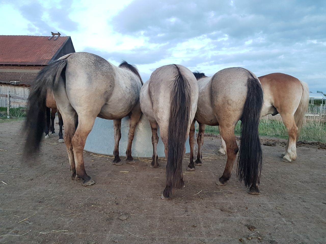 In den Wintermonaten wird Heu gefüttert, welches wir selbst produzieren. Die Pferde fressen im Winter 10 Stunden an insgesamt 6 überdachten Heuraufen (je 12 Plätze) . Anschließend steht Weizenstroh in jeweils zwei weiteren Raufen zur Verfügung.