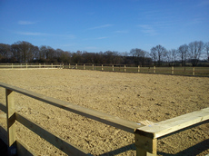 Der beleuchtete Reitplatz hat die Maße 20m x 40m und ist auch mit Kirchhellener Reitsand beschichtet.