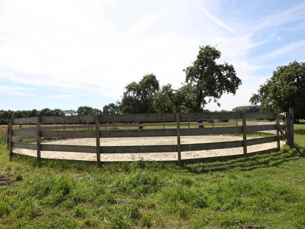 Der Round Pen liegt direkt am Auslauf und ist beleuchtet. Mit 16m Durchmesser eignet er sich ideal zum Longieren und Trainieren. Aufgrund des Kirchhellener Reitsandes bietet dieser Platz bei jeder Witterung einen geeigneten Untergrund.